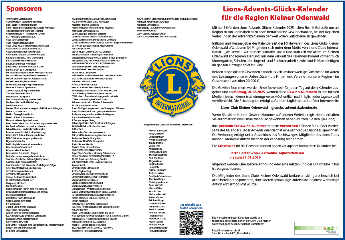 Ihre persönliche Gewinn-Nummer mit dem Vorzeichen K finden Sie auf der Vorderseite des Kalenders. Jeder Adventskalender hat eine sehr große Chance zu gewinnen. Die Verlosung erfolgt unter Ausschluss des Rechtsweges. Mitglieder des Lions Clubs Kleiner Odenwald dürfen nicht an der Verlosung teilnehmen.